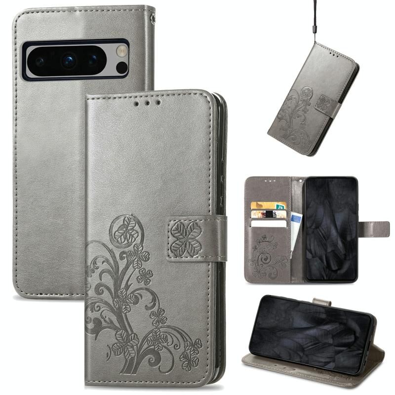 Για το Google Pixel 8 Pro τετράφυλλο κούμπωμα ανάγλυφη δερμάτινη θήκη τηλεφώνου (γκρι)