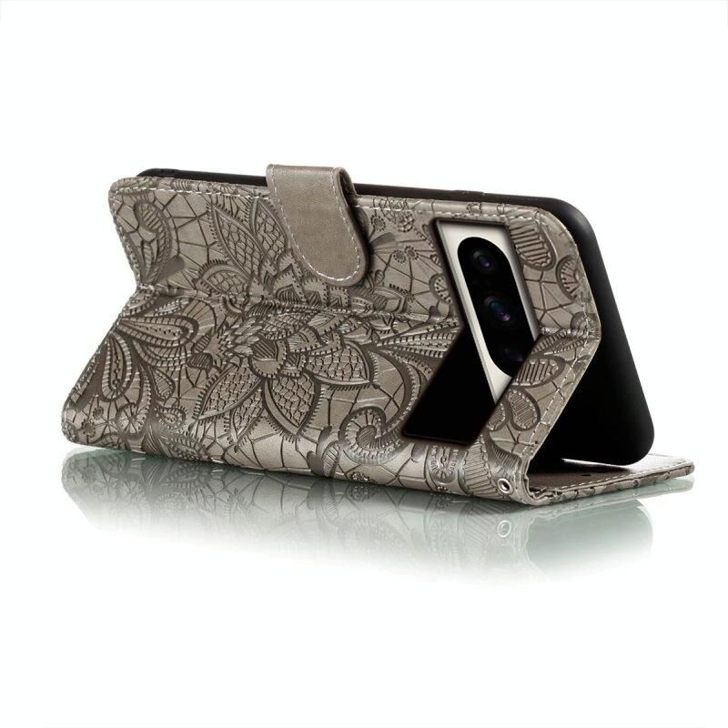 Για το Google Pixel 8 Pro Lace λουλούδι ανάγλυφο Flip υπόθεση τηλεφώνου δέρμα (γκρι)