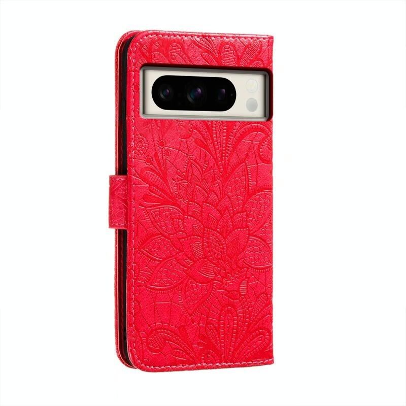 Για το Google Pixel 8 Pro Lace λουλούδι ανάγλυφο Flip υπόθεση τηλεφώνου δέρμα (κόκκινο)