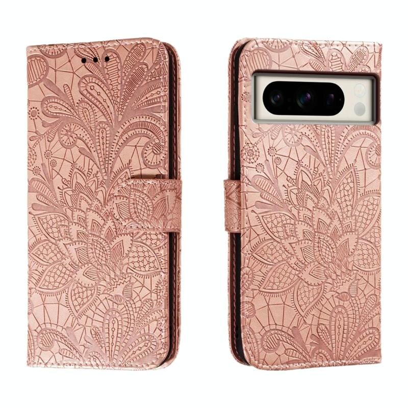 Για το Google Pixel 8 Pro Lace λουλούδι ανάγλυφο Flip υπόθεση τηλεφώνου δέρμα (Rose Gold)