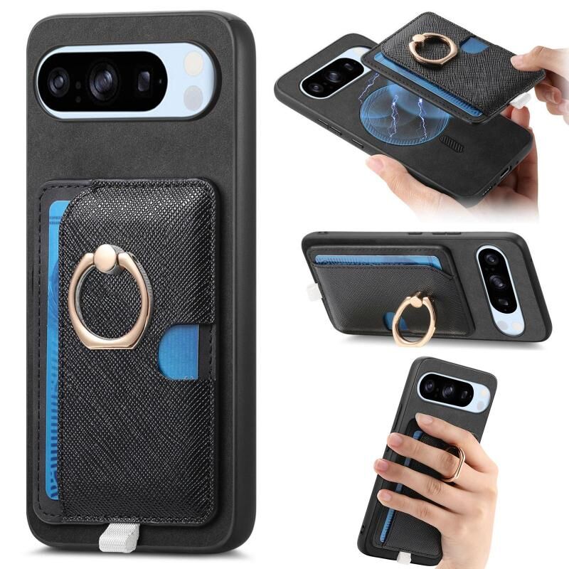 For Google Pixel 8 Pro Retro Cross Leather Ring Side Insert Card Bag MagSafe Phone Case(Black)