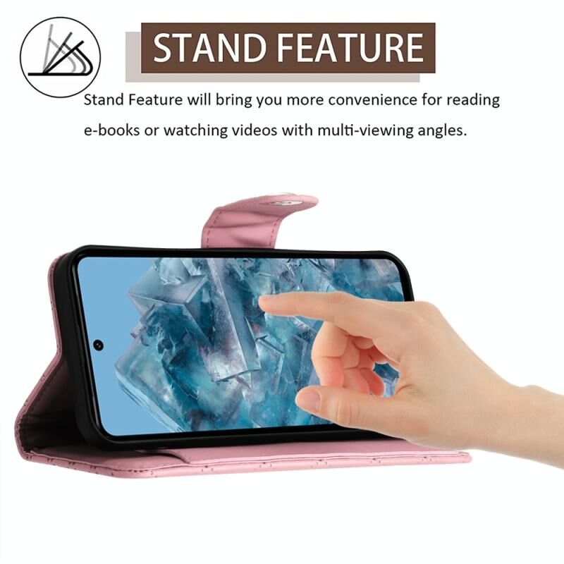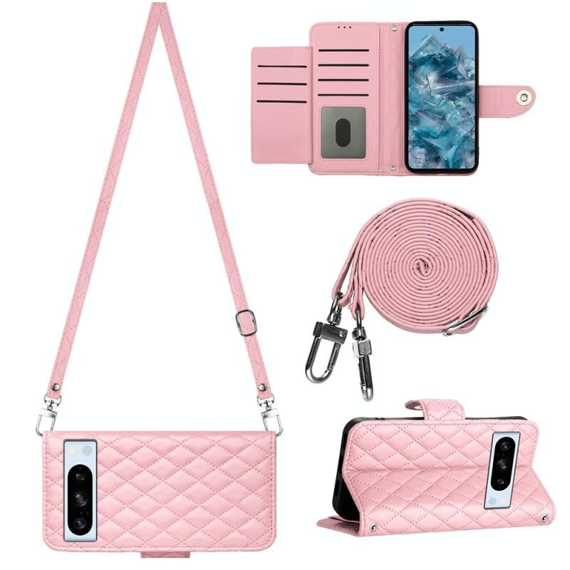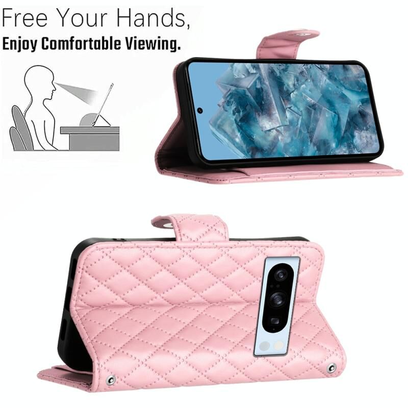 Για το Google Pixel 8 Pro Rhombic Texture Flip δερμάτινη θήκη τηλεφώνου με μακρύ κορδόνι (ροζ)