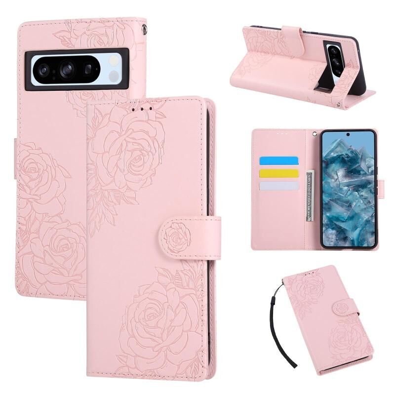 For Google Pixel 8 Pro Rose Flower Embossed 3-Card Slots Leather Phone Case(Pink)