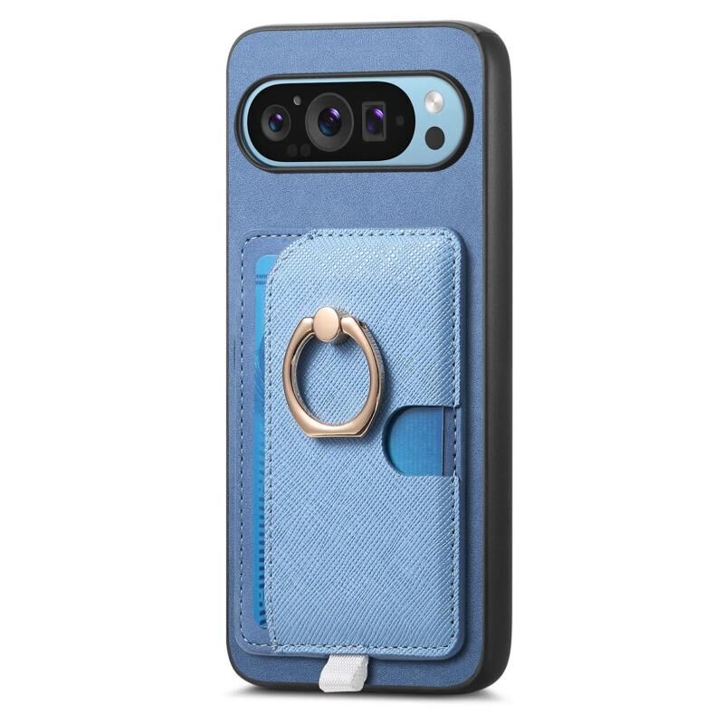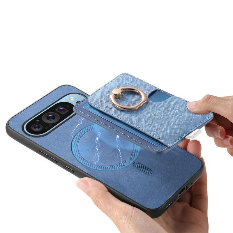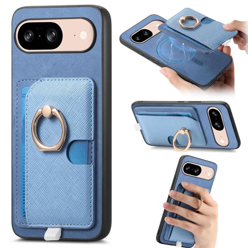 For Google Pixel 8 Retro Cross Leather Ring Side Insert Card Bag MagSafe Phone Case(Blue)