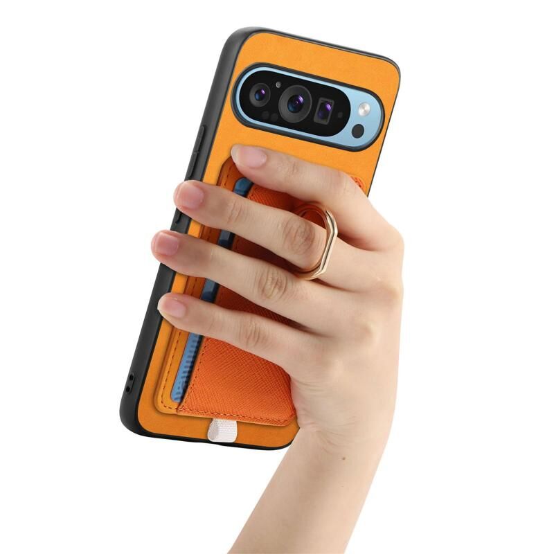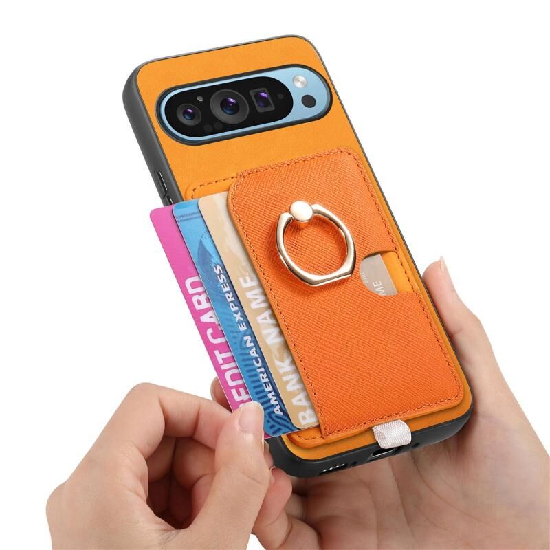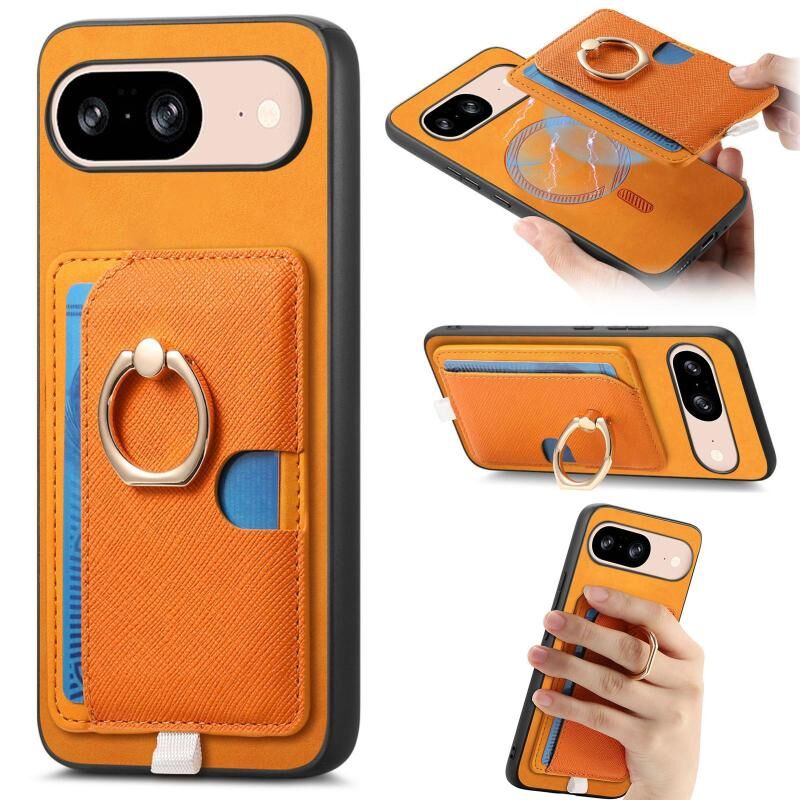 For Google Pixel 8 Retro Cross Leather Ring Side Insert Card Bag MagSafe Phone Case(Yellow)