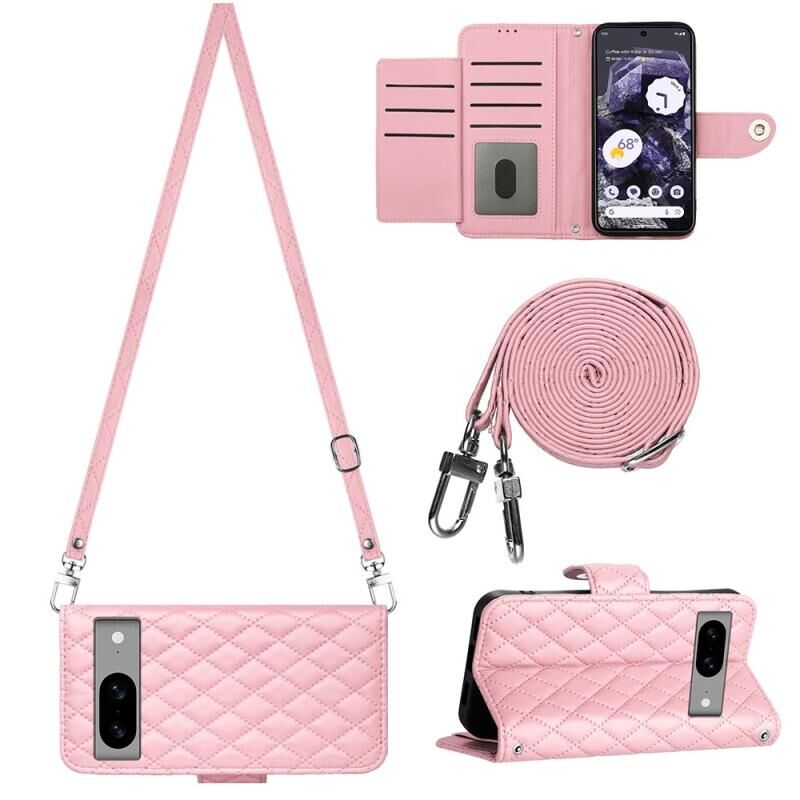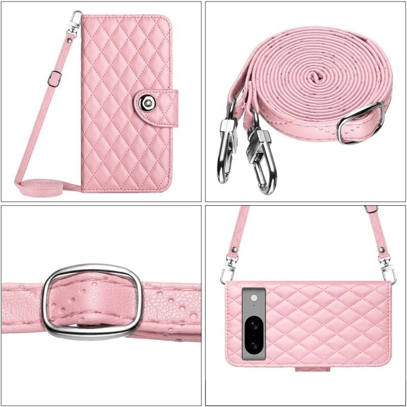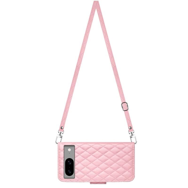 Για το Google Pixel 8 Rhombic Texture Flip δερμάτινη θήκη τηλεφώνου με μακρύ κορδόνι (ροζ)