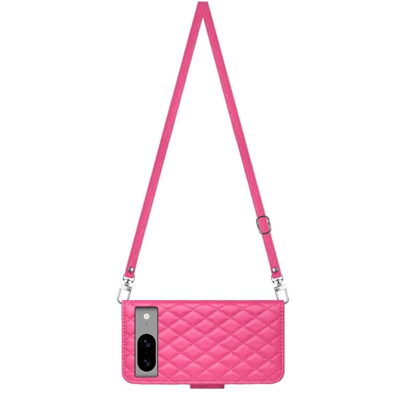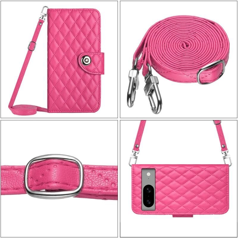 Για το Google Pixel 8 Rhombic Texture Flip δερμάτινη θήκη τηλεφώνου με μακρύ κορδόνι (Rose Red)