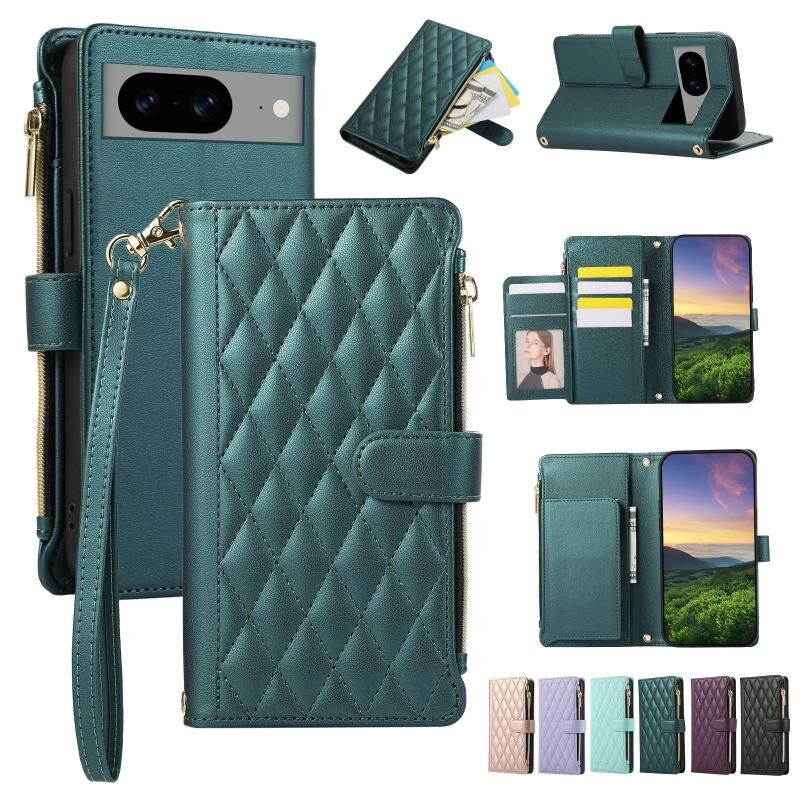 Για το Google Pixel 8 Ρομβική φερμουάρ πορτοφόλι δερμάτινη θήκη τηλεφώνου (πράσινο)