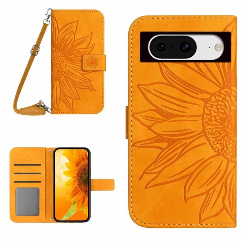 Για το Google Pixel 8 Skin Feel Sun Flower ανάγλυφο ανάγλυφο Flip δέρμα υπόθεση τηλεφώνου με κορδόνι (κίτρινο)