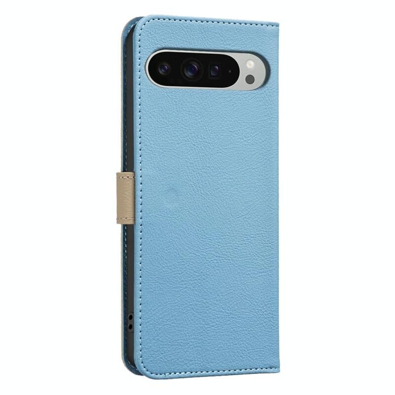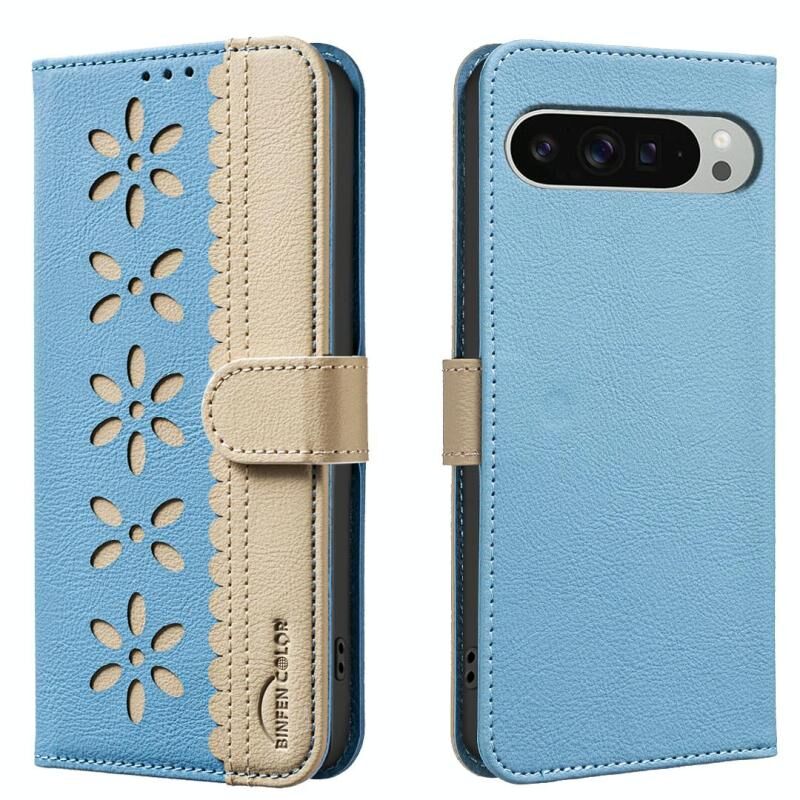 For Google Pixel 8 Splicing Color Hollow Flower Pattern RFID Leather Phone Case(Baby Blue)
