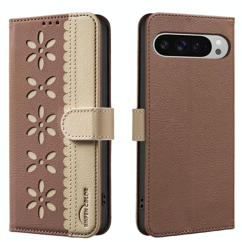 For Google Pixel 8 Splicing Color Hollow Flower Pattern RFID Leather Phone Case(Brown)