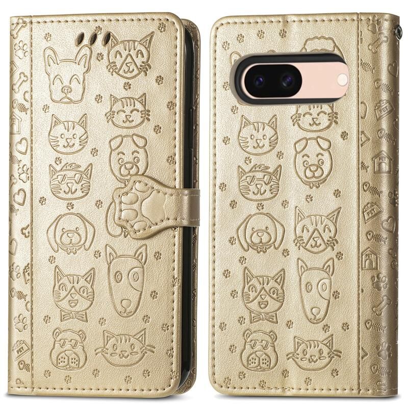 For Google Pixel 8a Cat and Dog Embossed Leather Phone Case(Gold)
