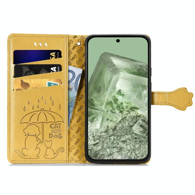 For Google Pixel 8a Cat and Dog Embossed Leather Phone Case(Yellow)