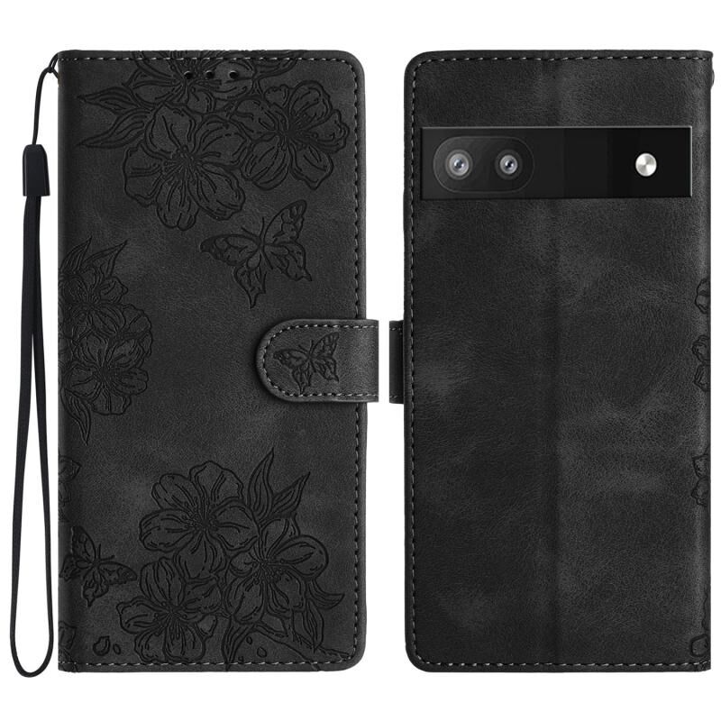 For Google Pixel 8a Cherry Blossom Butterfly Skin Feel Embossed PU Phone Case(Black)