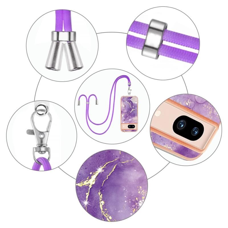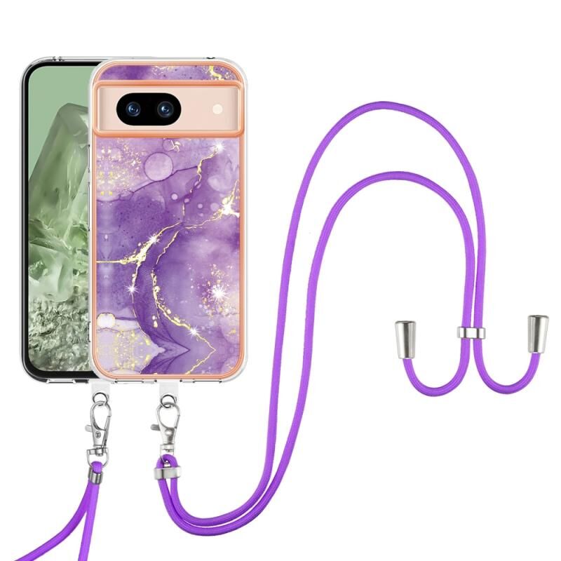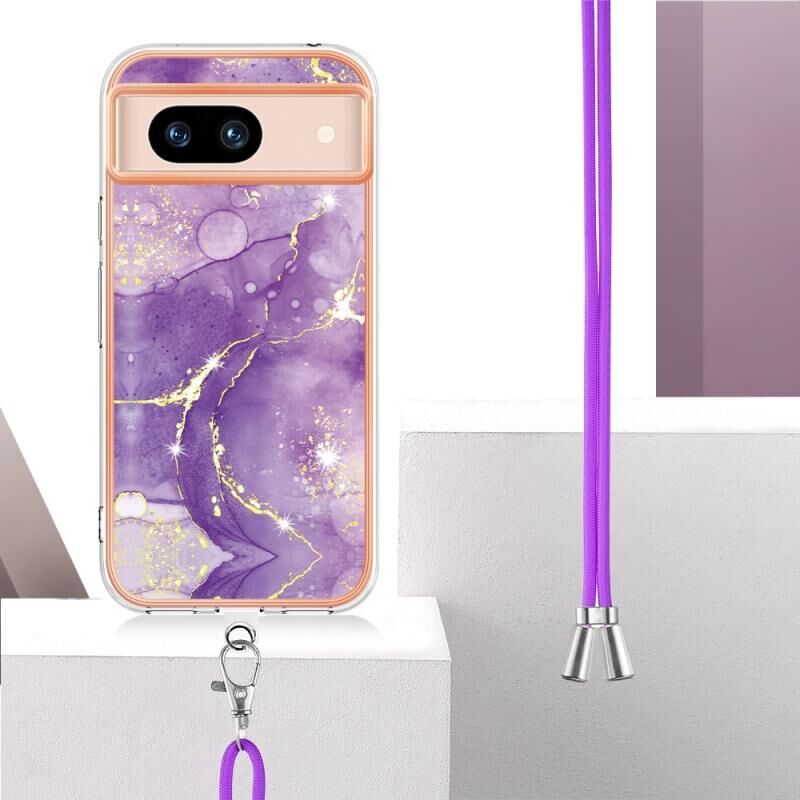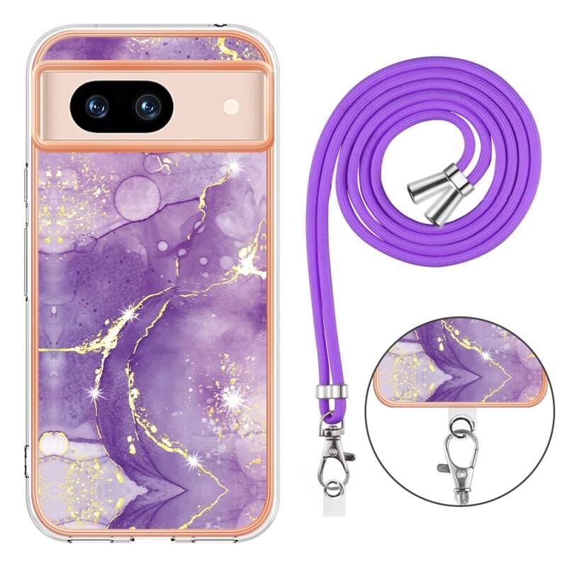 For Google Pixel 8a Electroplating Marble Dual-side IMD Phone Case with Lanyard(Purple 002)