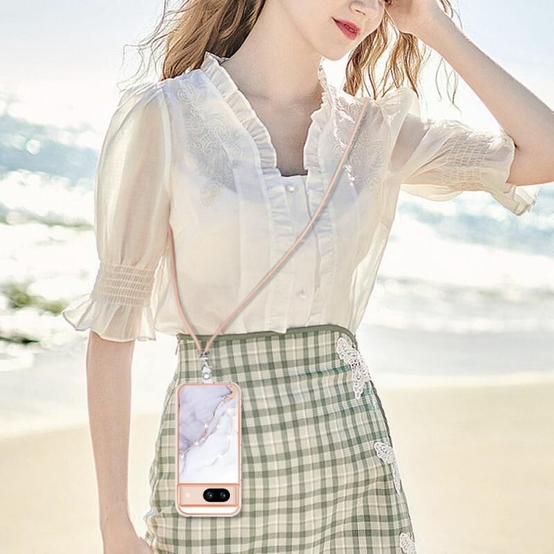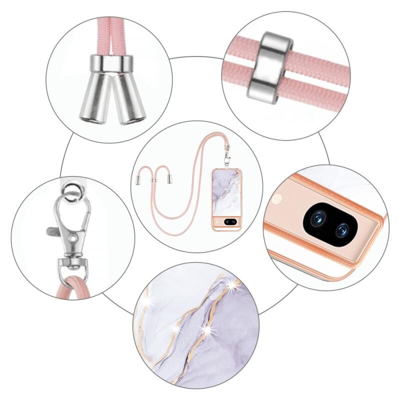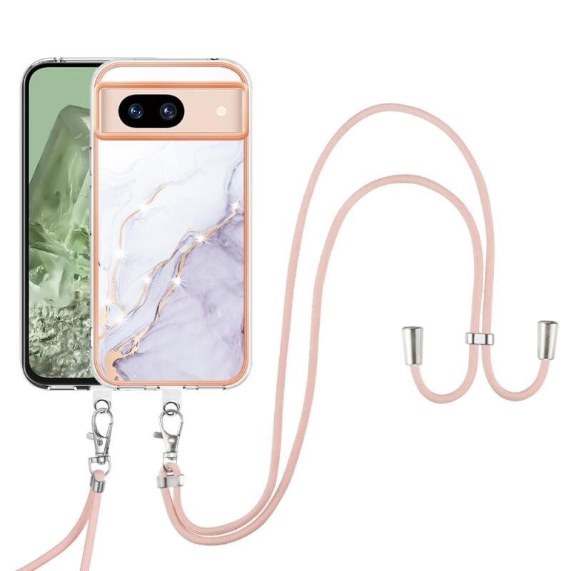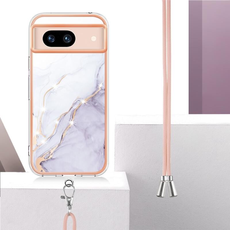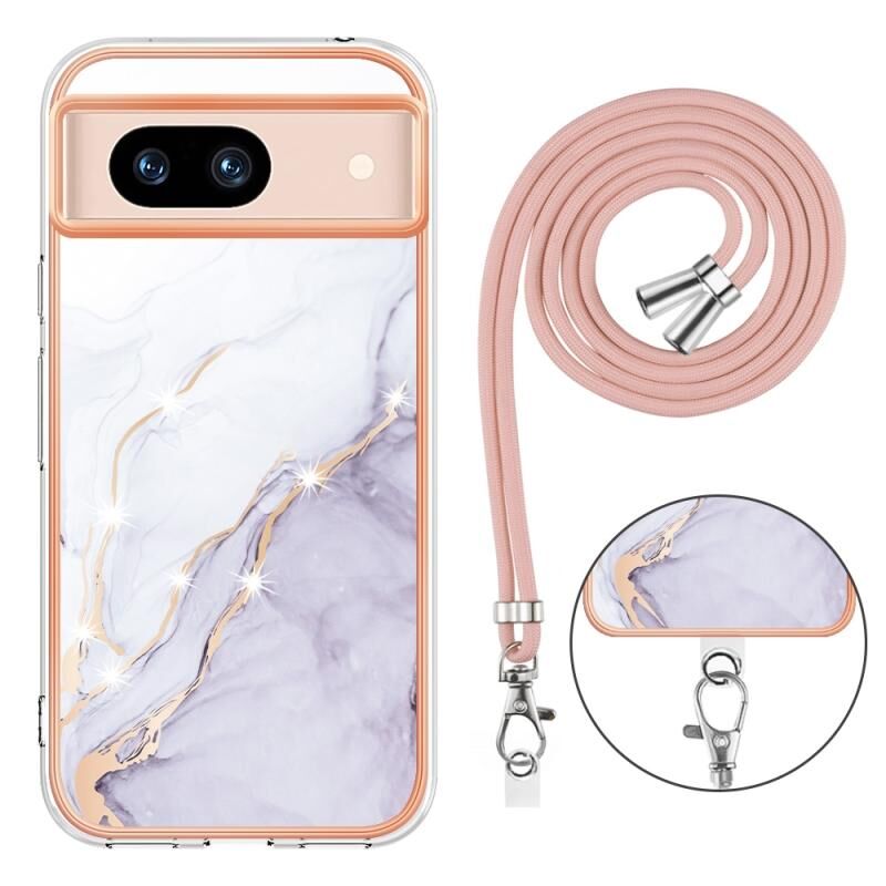 For Google Pixel 8a Electroplating Marble Dual-side IMD Phone Case with Lanyard(White 006)