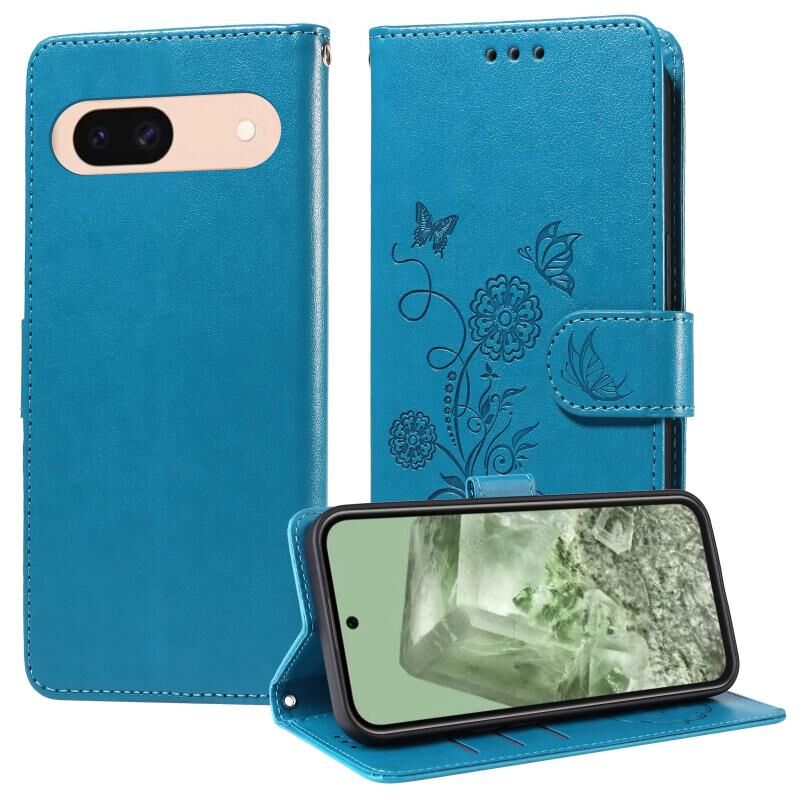 Θήκη τηλεφώνου από δέρμα με ανάγλυφα σχέδια πεταλούδας και λουλουδιών για Google Pixel 8a (Μωβ)