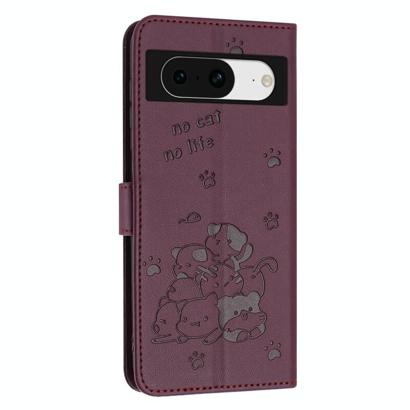 Θήκη δερμάτινη για Google Pixel 8a με ανάγλυφο γατάκι και κορδόνι (Μωβ)