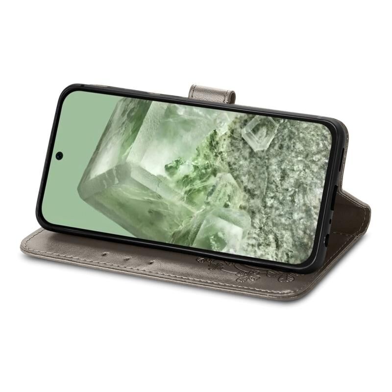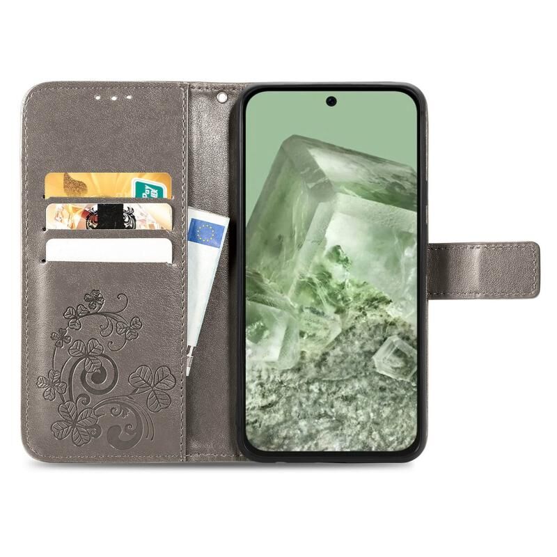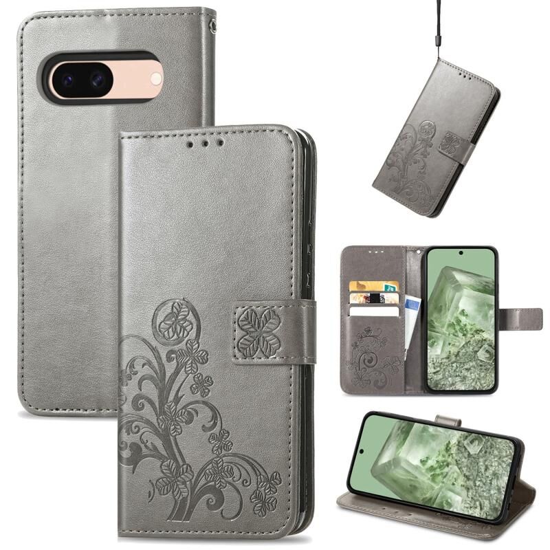 Για το Google Pixel 8a τετράφυλλο κούμπωμα ανάγλυφη δερμάτινη θήκη τηλεφώνου (γκρι)