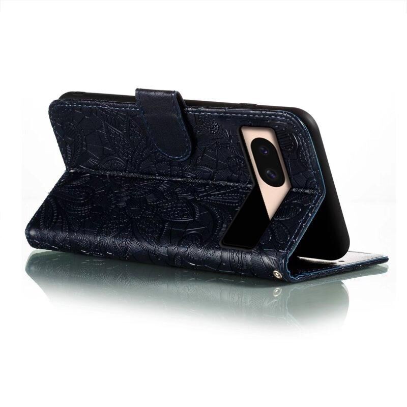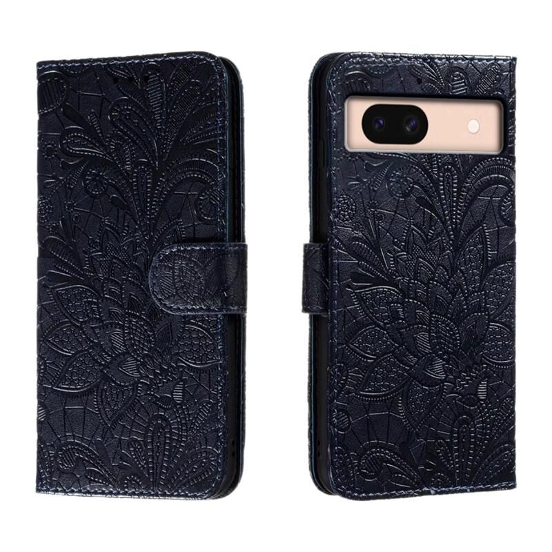 Για το Google Pixel 8A Lace λουλούδι ανάγλυφο Flip υπόθεση τηλεφώνου δέρμα (σκούρο μπλε)