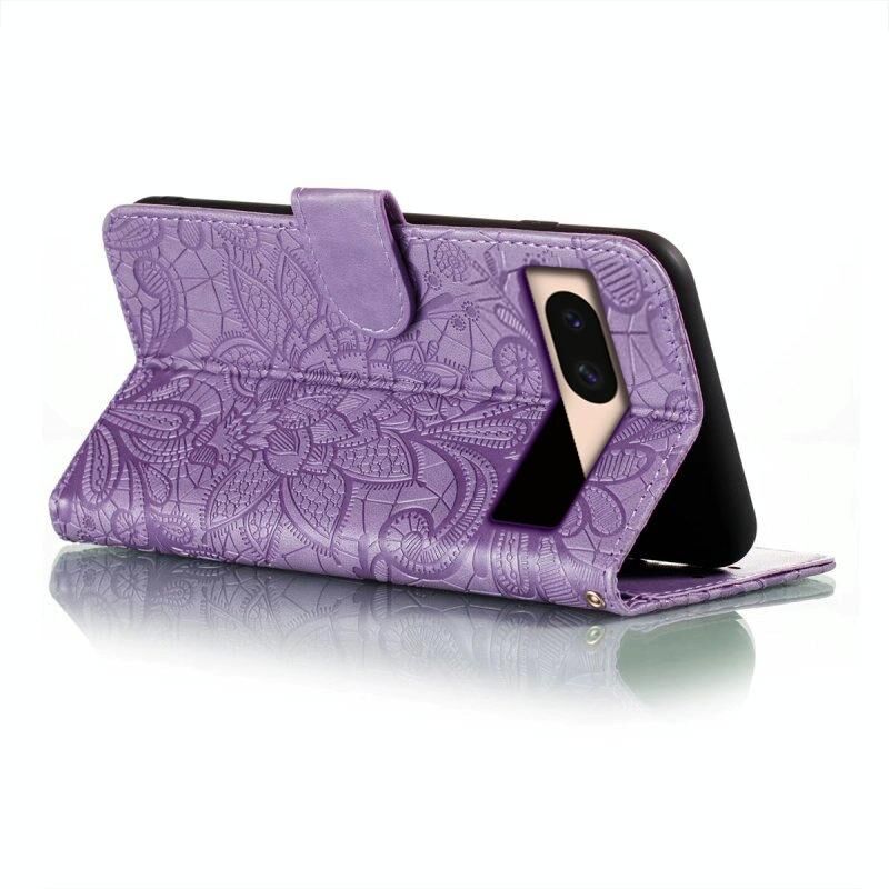 Για το Google Pixel 8A Lace λουλούδι ανάγλυφο Flip υπόθεση τηλεφώνου δέρμα (μωβ)