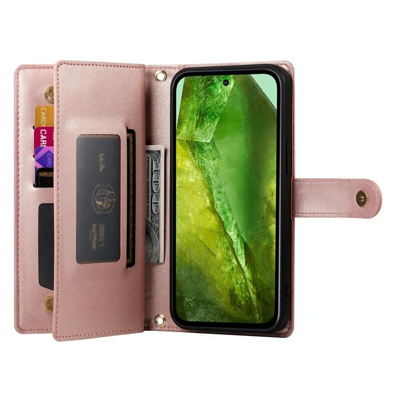 Για το Google Pixel 8a Εννέα κάρτα-θυρίδα φερμουάρ πορτοφόλι τσάντα δερμάτινη θήκη τηλεφώνου (ροζ)