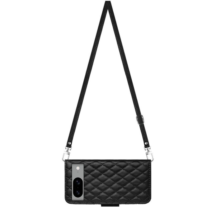 Για το Google Pixel 8a Rhombic Texture Flip δερμάτινη θήκη τηλεφώνου με μακρύ κορδόνι (Μαύρο)