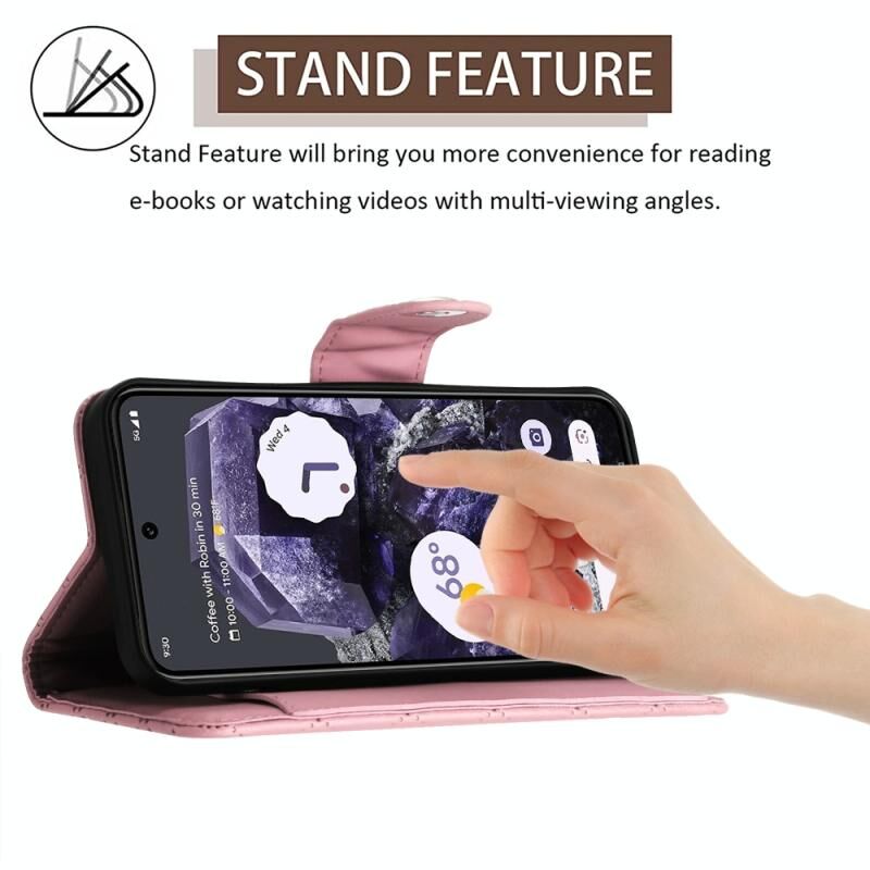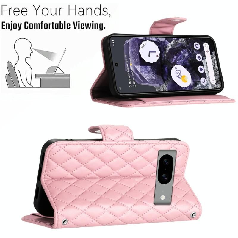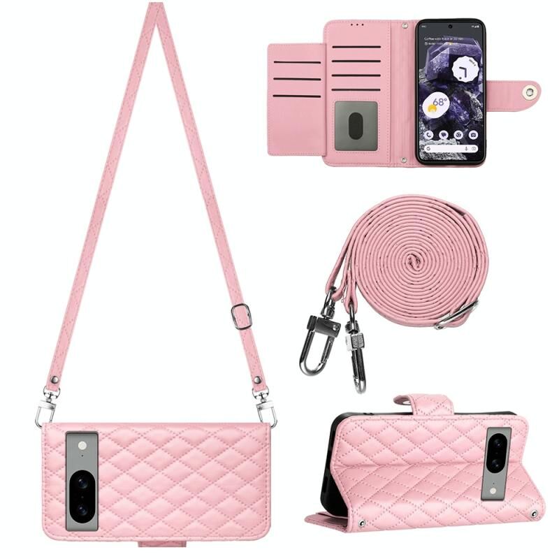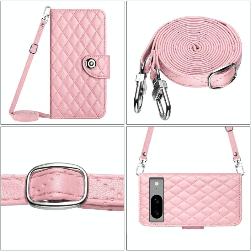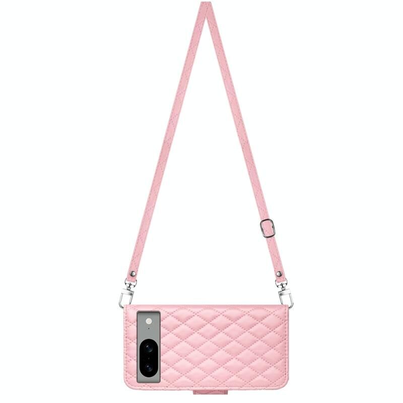 Για το Google Pixel 8a Rhombic Texture Flip δερμάτινη θήκη τηλεφώνου με μακρύ κορδόνι (ροζ)