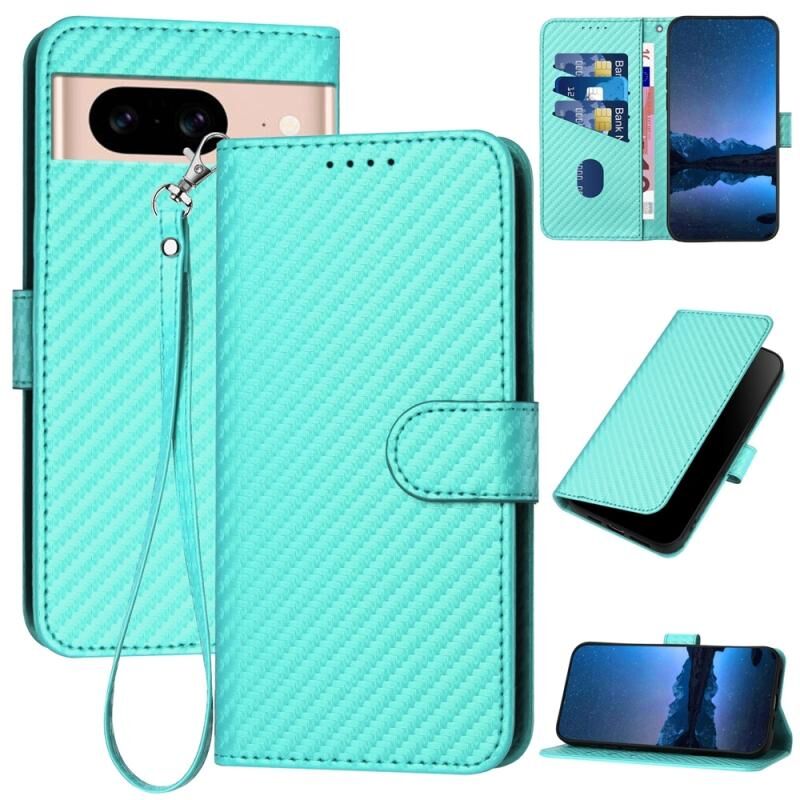 For Google Pixel 8a YX0070 Carbon Fiber Buckle Leather Phone Case with Lanyard(Light Blue)