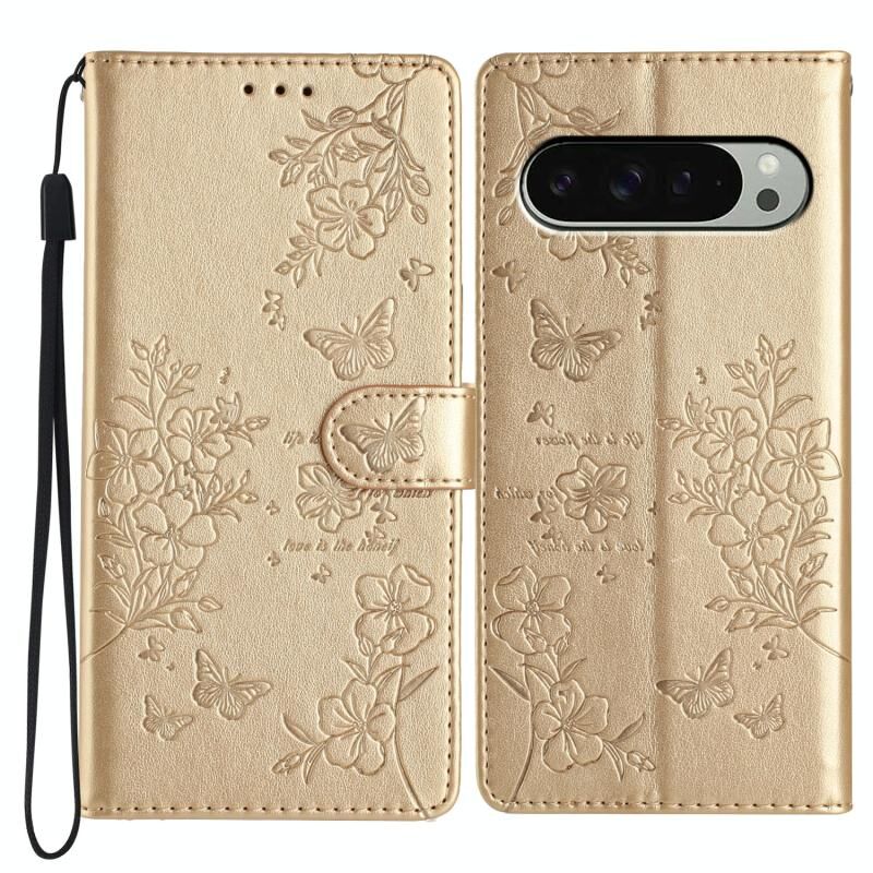 Θήκη τηλεφώνου από δέρμα με πεταλούδες και λουλούδια για Google Pixel 9 / 9 Pro (Χρυσό)