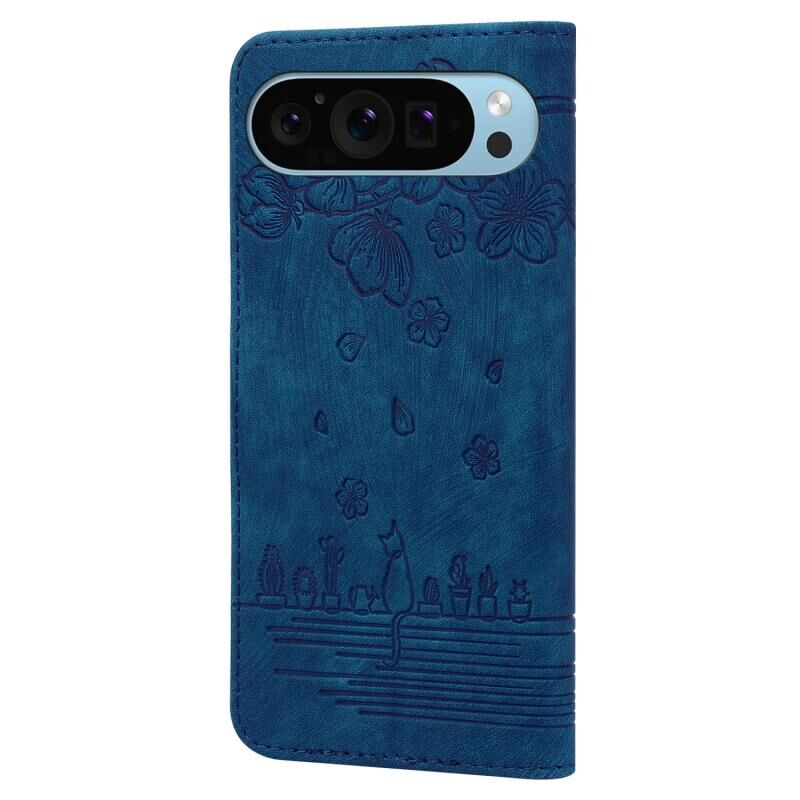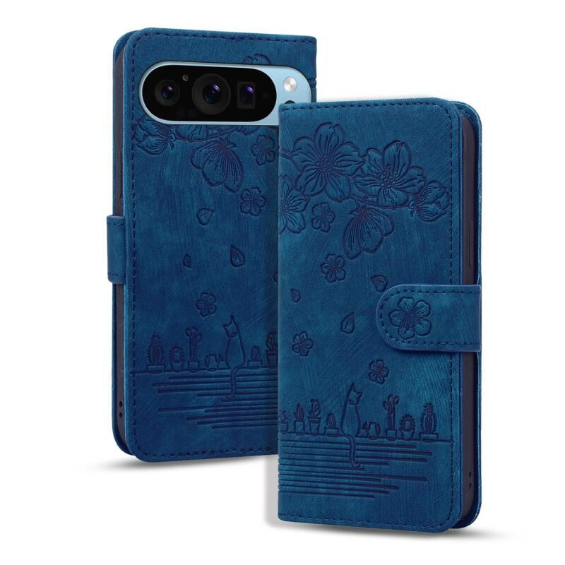 For Google Pixel 9 / 9 Pro Cartoon Sakura Cat Embossed Leather Phone Case(Blue)