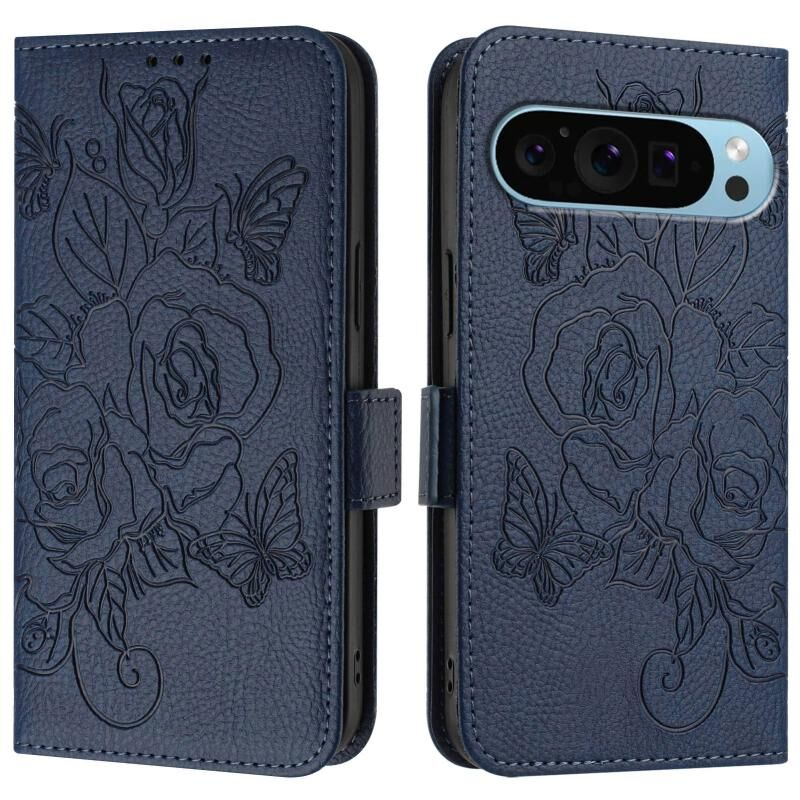 For Google Pixel 9 / 9 Pro Embossed Rose RFID Anti-theft Leather Phone Case(Dark Blue)