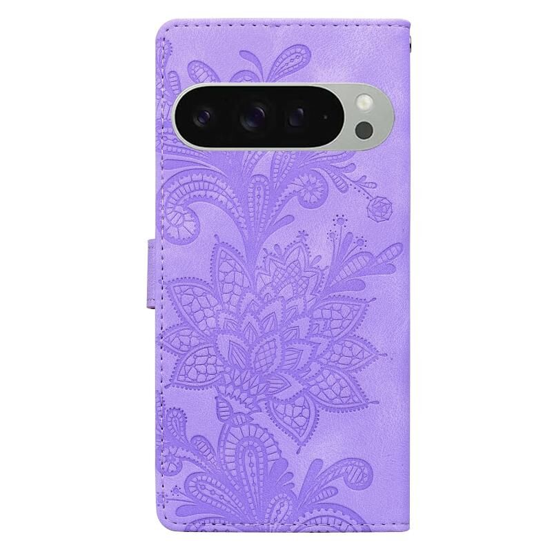 Θήκη τηλεφώνου Google Pixel 9 / 9 Pro με δαντέλα, λουλουδάτο ανάγλυφο, μαγνητικό κούμπωμα και λουρί καρπού (Μωβ)