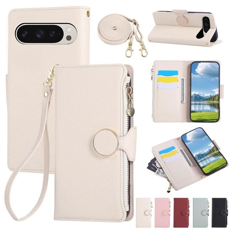 For Google Pixel 9 / 9 Pro Round Buckle Zipper Wallet Leather Phone Case with Crossbody Strap(White)