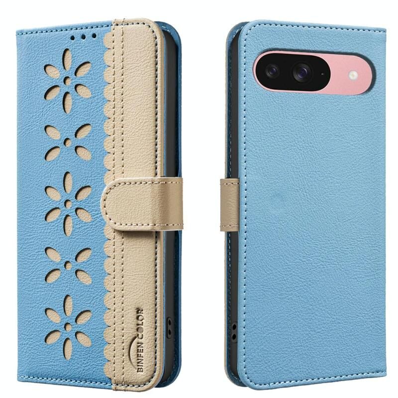 For Google Pixel 9 / 9 Pro Splicing Color Hollow Flower Pattern RFID Leather Phone Case(Baby Blue)