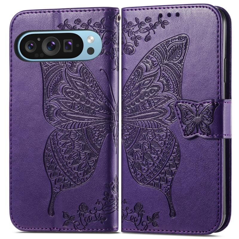 Θήκη τηλεφώνου από δέρμα με ανάγλυφο σχέδιο πεταλούδας και λουλουδιών για Google Pixel 9 (Μπλε)