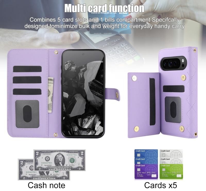 Για το Google Pixel 9 Crossbody Πολυλειτουργική θήκη τηλεφώνου από δέρμα (μωβ)