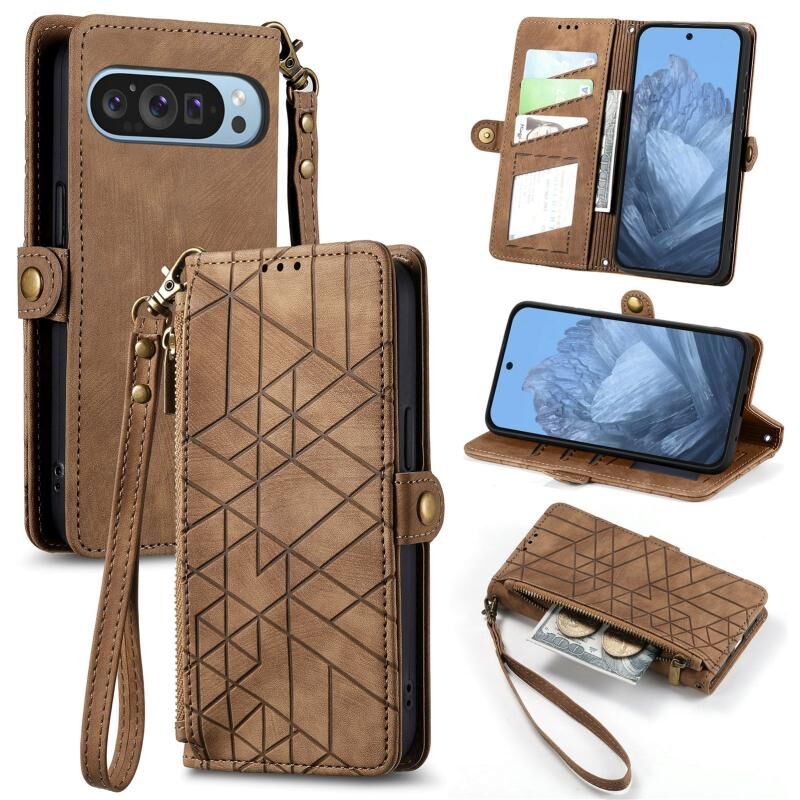 Για Google Pixel 9 γεωμετρική φερμουάρ πορτοφόλι πλευρά πόρπη δερμάτινη θήκη τηλεφώνου (καφέ)