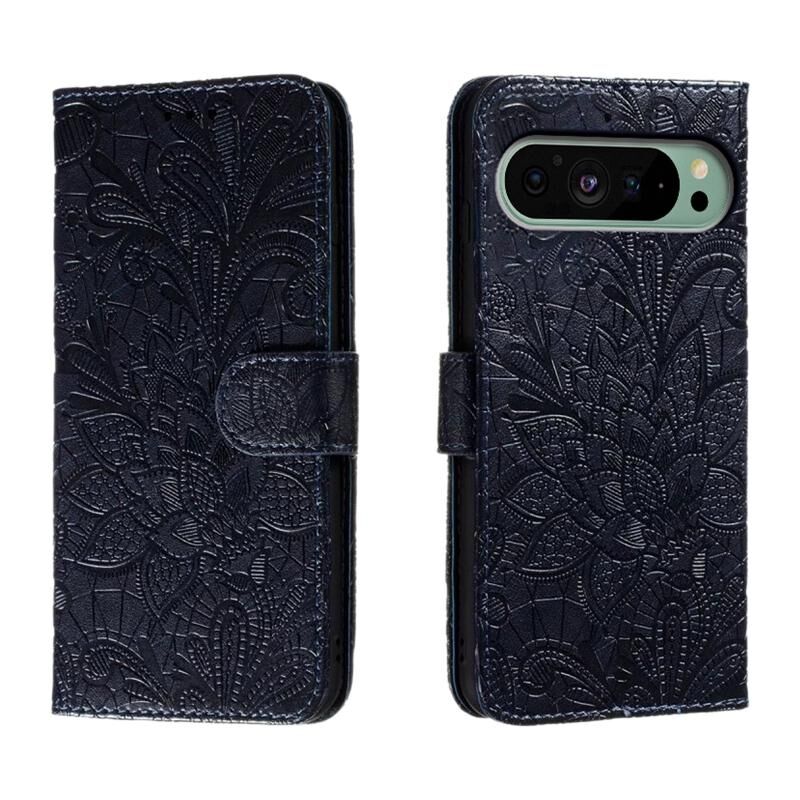 Για το Google Pixel 9 Lace λουλούδι ανάγλυφο Flip υπόθεση τηλεφώνου δέρμα (σκούρο μπλε)