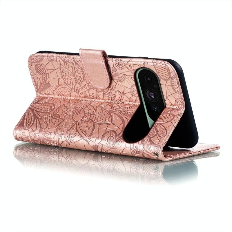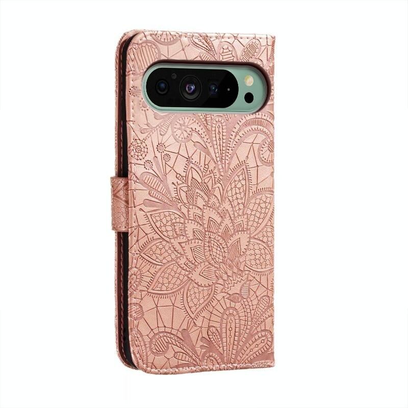 Για το Google Pixel 9 Lace λουλούδι ανάγλυφο Flip θήκη τηλεφώνου δέρμα (Rose Gold)