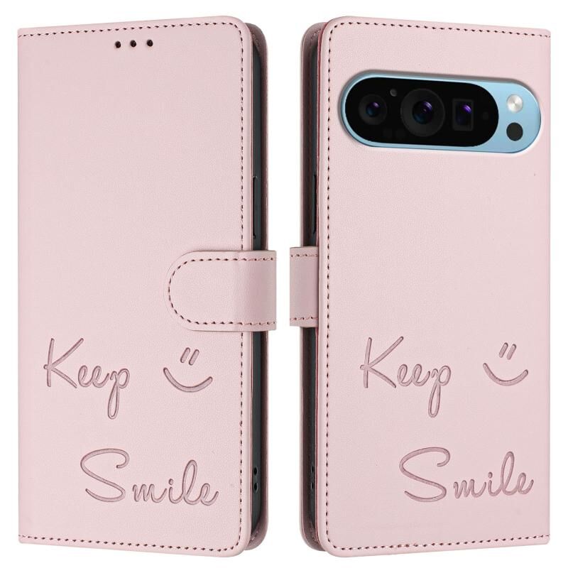 Για το Google Pixel 9 / Pixel 9 Pro Smile ανάγλυφη RFID δερμάτινη θήκη τηλεφώνου (ροζ)