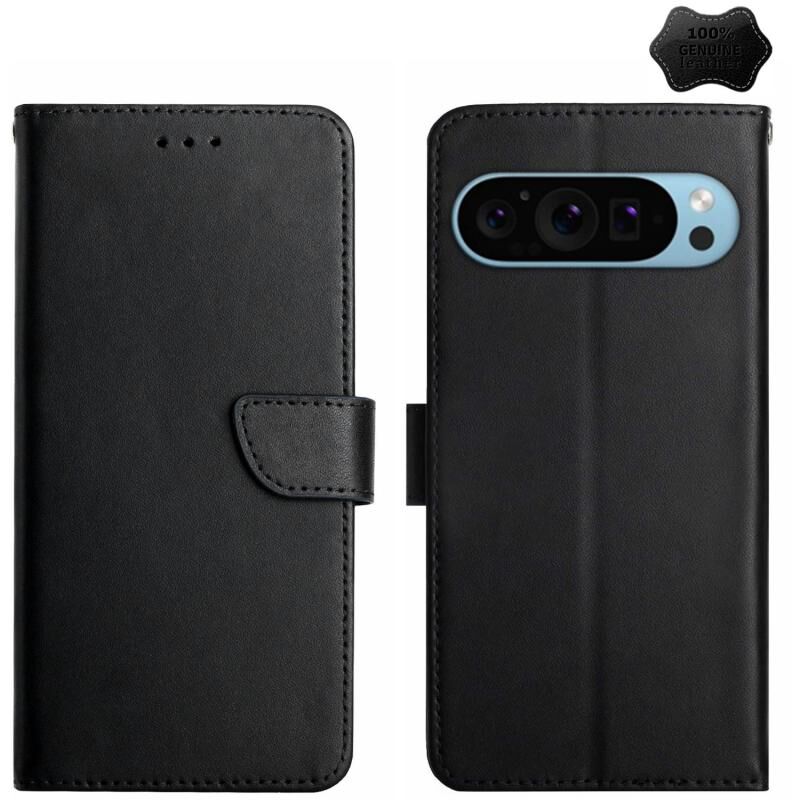 Θήκη Flip από Γνήσιο Δέρμα για Google Pixel 9 Pro HT02, Ανθεκτική στα Δακτυλικά Αποτυπώματα (Μαύρο)