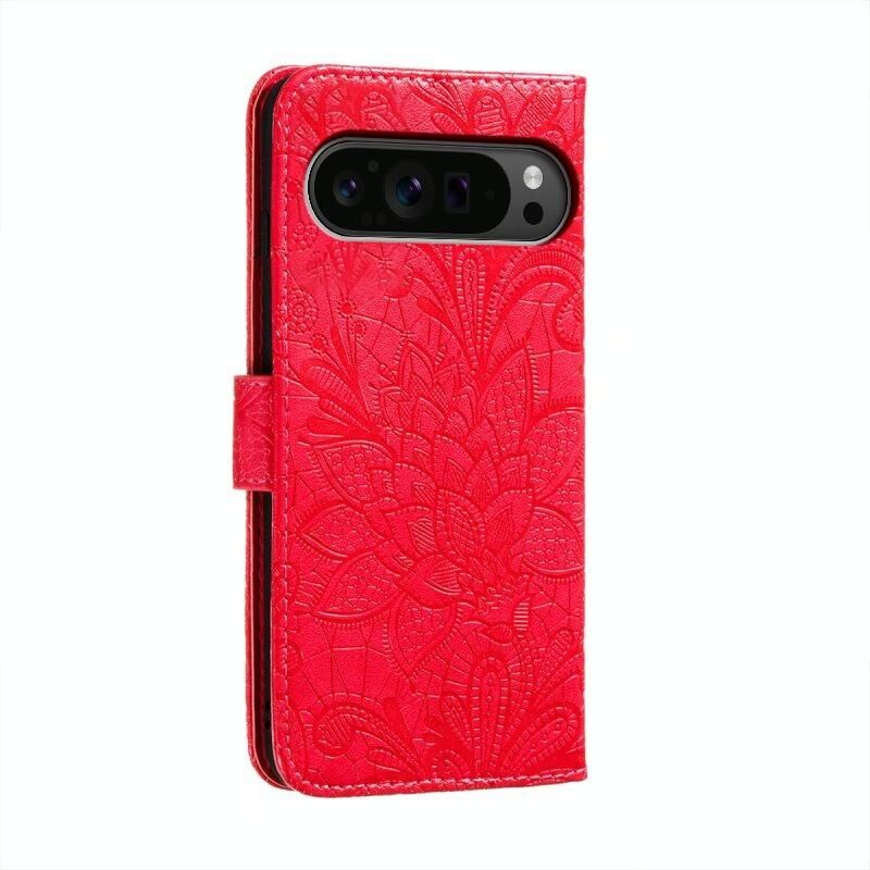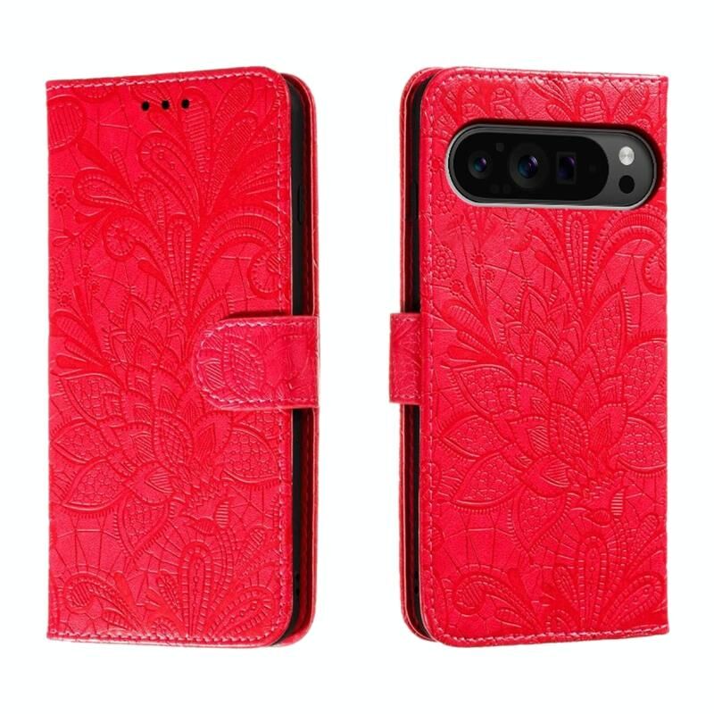 Για το Google Pixel 9 Pro Lace λουλούδι ανάγλυφο Flip υπόθεση τηλεφώνου δέρμα (κόκκινο)
