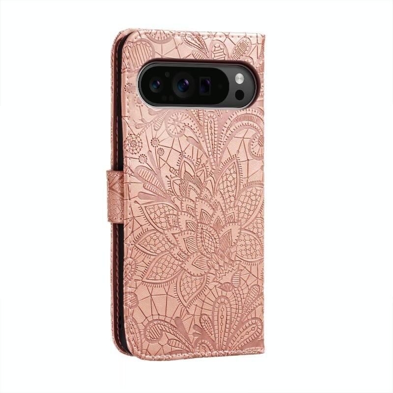 Για το Google Pixel 9 Pro Lace λουλούδι ανάγλυφο Flip υπόθεση τηλεφώνου δέρμα (Rose Gold)