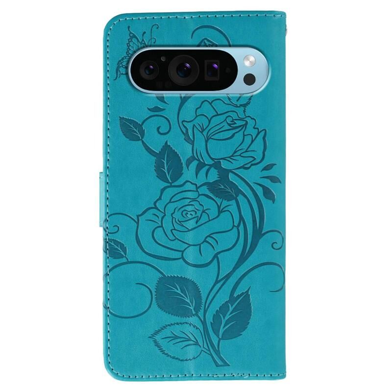 For Google Pixel 9 Pro Rose Butterfly Embossed Leather Phone Case(Blue)