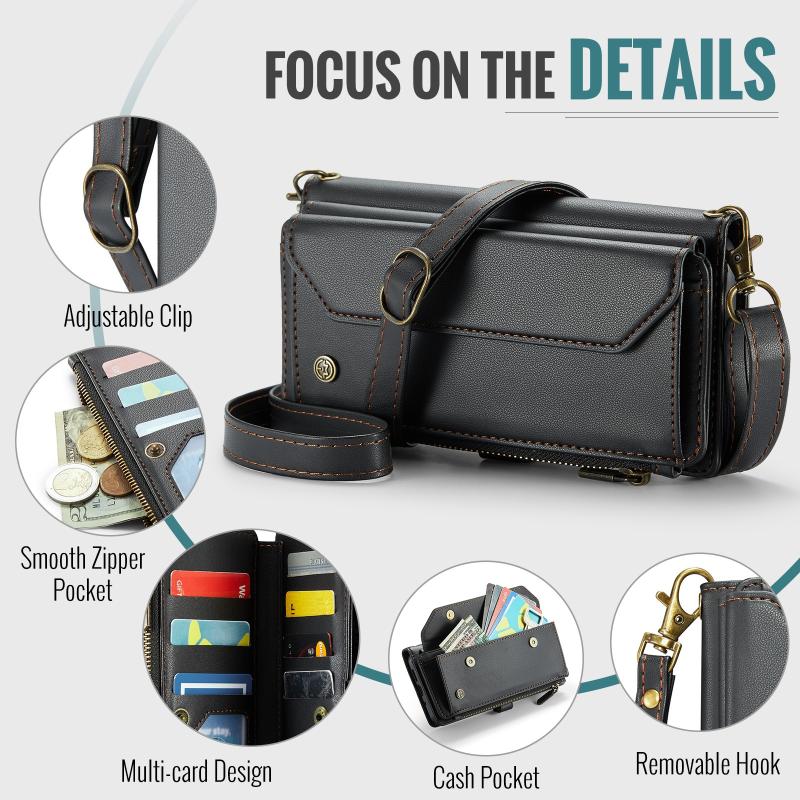 6. 10 Card Slots + 2 Money Clip Positions + 1 Zipper Pouch + Long Shoulder Strap Lanyard + Short Hand Strap (Actual subject to picture)