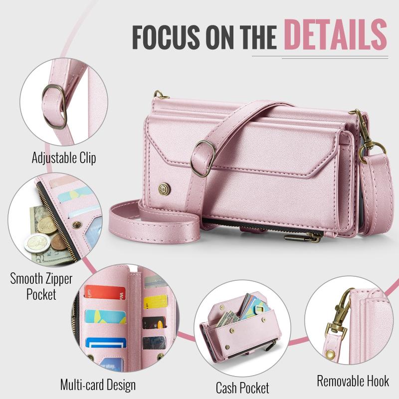 6. 10 Card Slots + 2 Money Clip Positions + 1 Zipper Pouch + Long Shoulder Strap Lanyard + Short Hand Strap (Actual subject to picture)