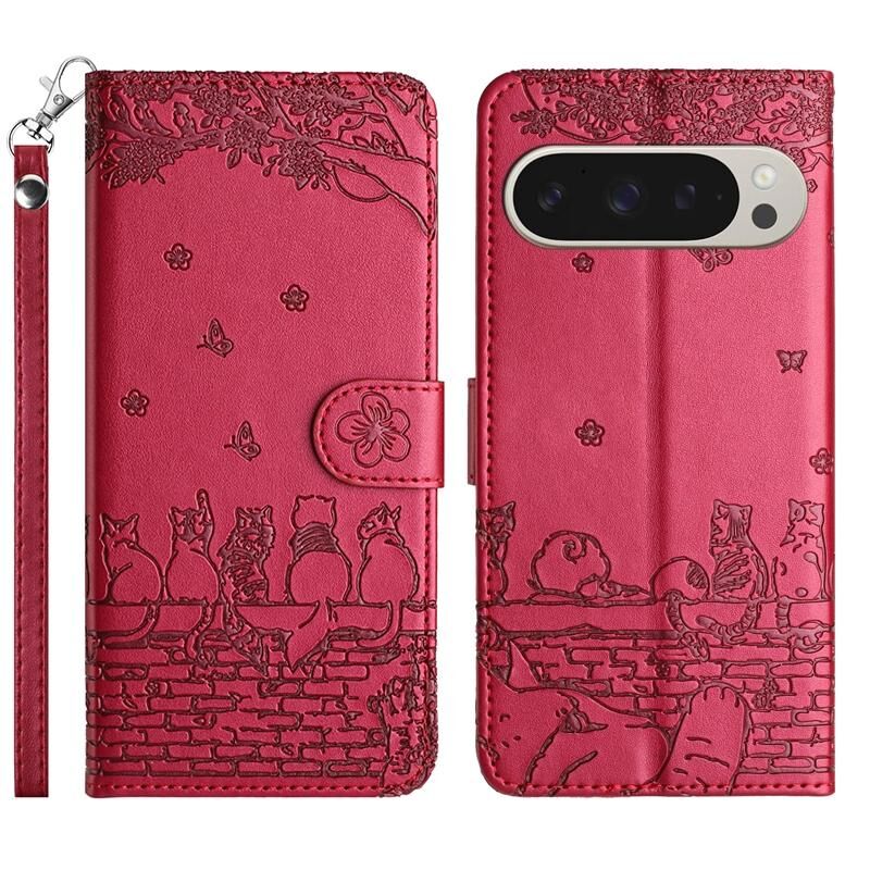 For Google Pixel 9 Pro XL Cat Embossing Pattern Leather Phone Case with Lanyard(Red)