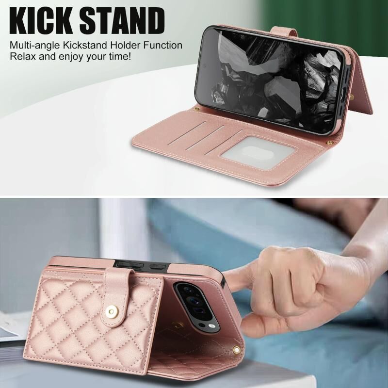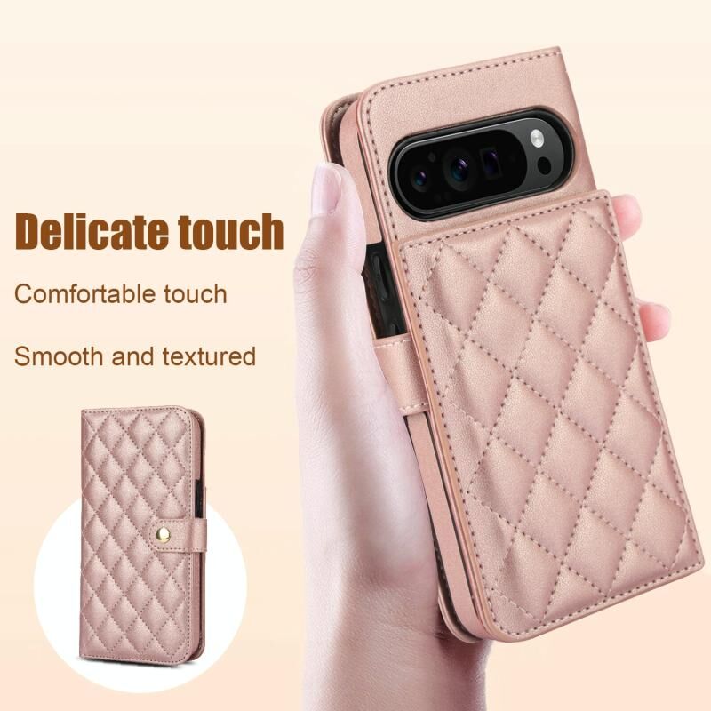 Για το Google Pixel 9 Pro XL Crossbody Πολυλειτουργική θήκη τηλεφώνου από ρομβοειδές δέρμα (ροζ χρυσό)