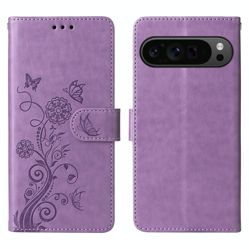 Θήκη τηλεφώνου δερμάτινη με ανάγλυφα σχέδια πεταλούδας και λουλουδιών για Google Pixel 9 Pro XL (Μωβ)